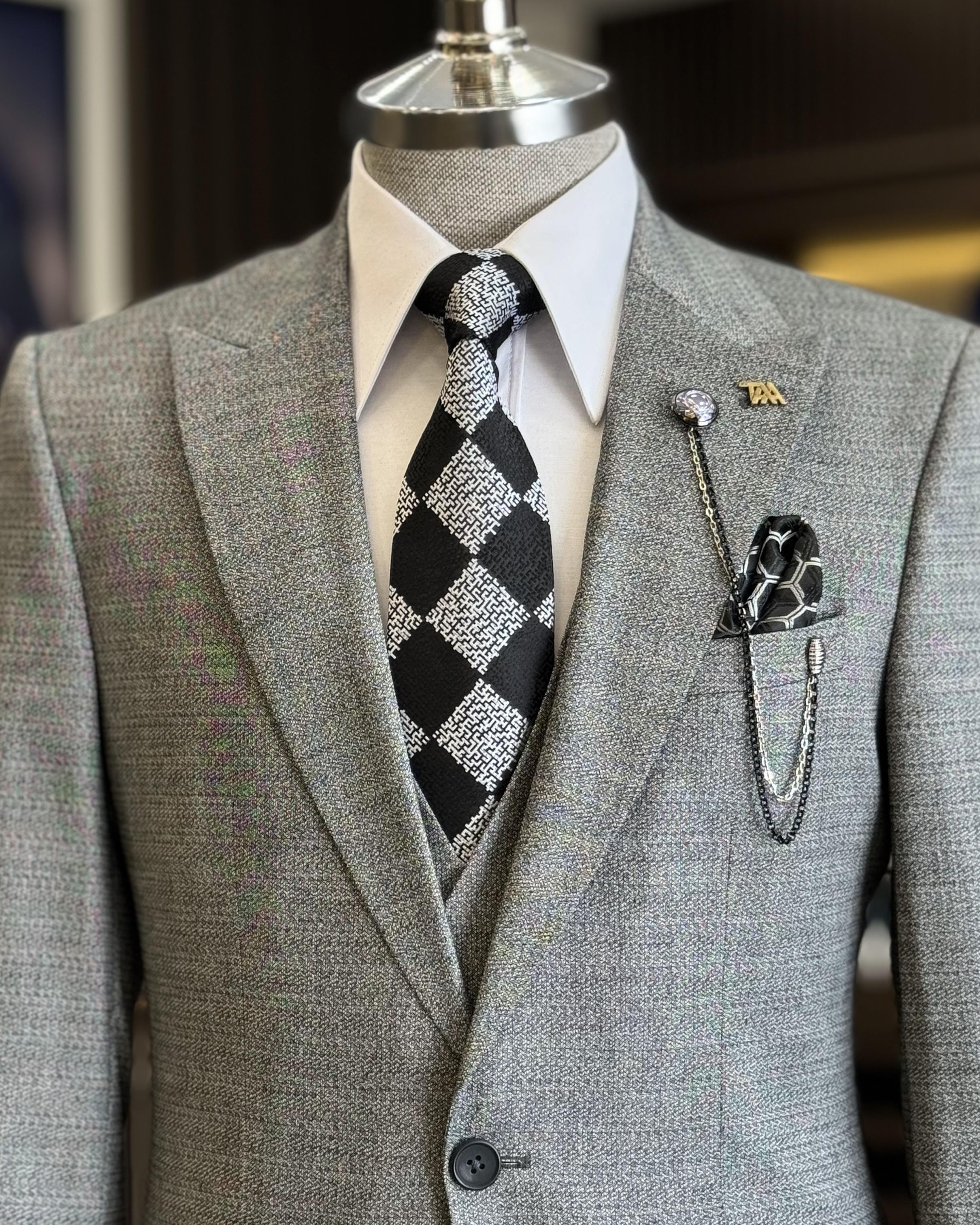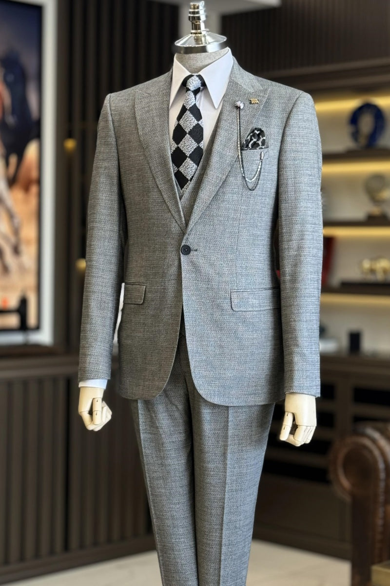 • Light Gray Modern Peaked Lapel 3 Pieces Business Suits For Men